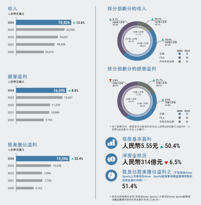 安踏体育2024年经营利润为165.95亿元,较上年同期的153.67亿元增长8%;股东应占盈利为156亿元,较上年同期的102.36亿元增长52.4%